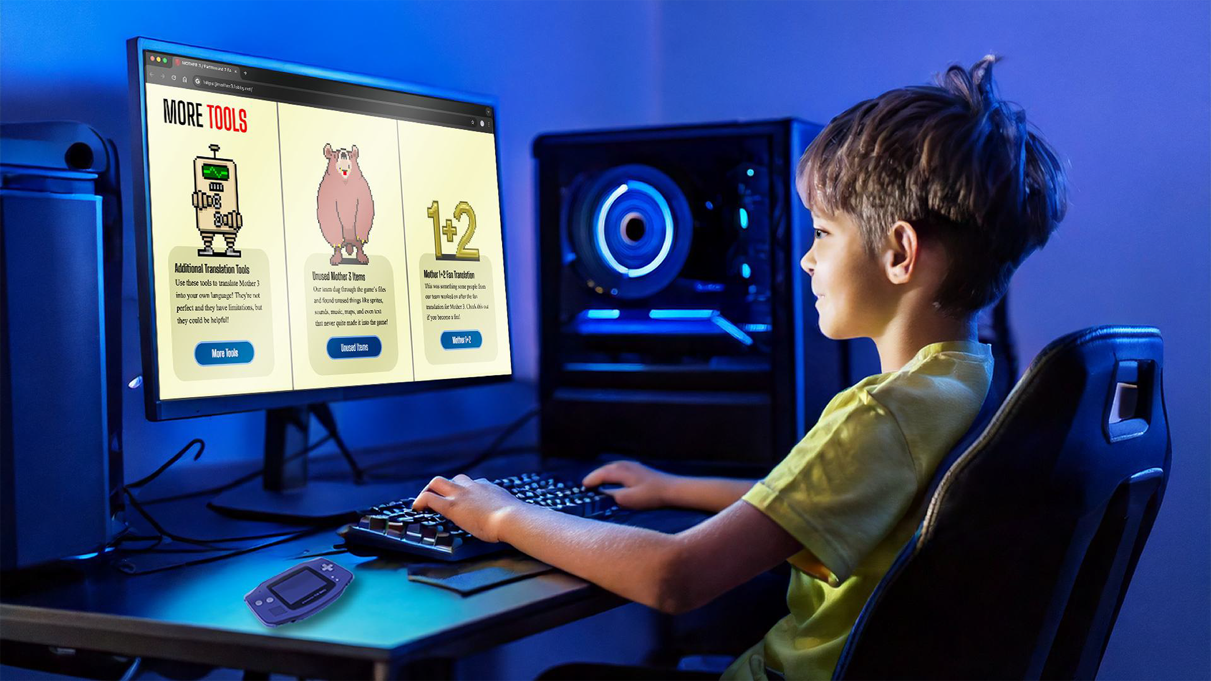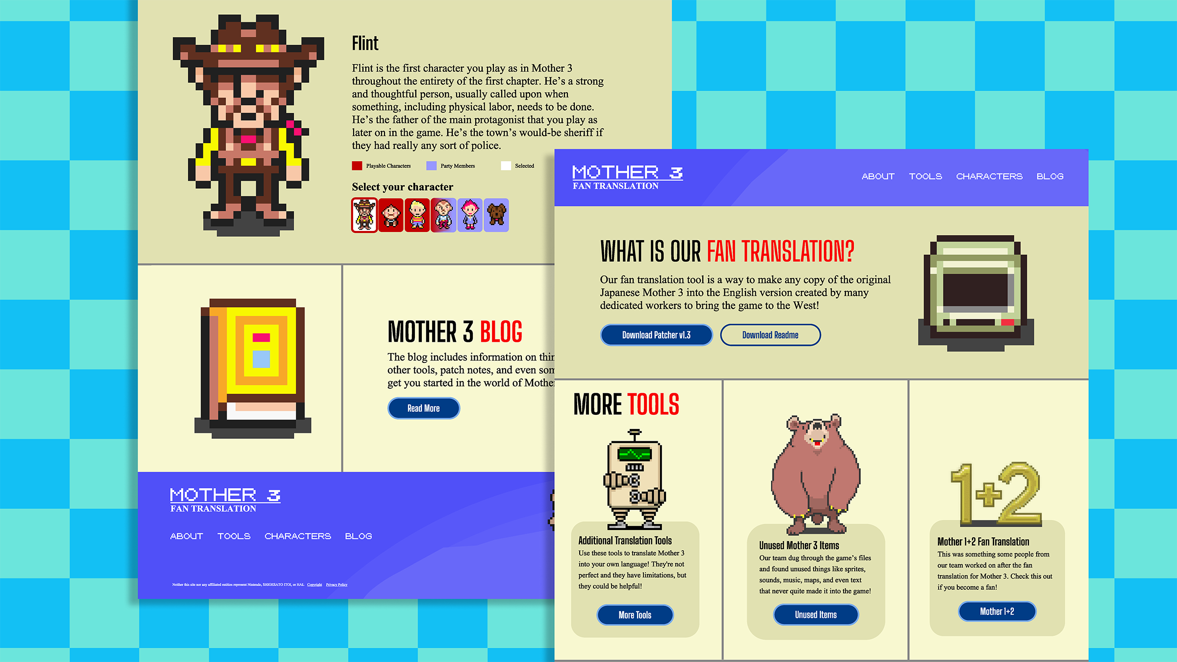 The original website for the Mother 3 fan translation was hard to follow due to the large amounts of text and bad layout. My first design tried to capture more of the original color scheme and use of sprites as the original website did. I wanted to upgrade the look again so it would stand out. I went for a retro gaming look since the Mother series was started in 1989 and was a part of many people’s childhoods. I also made the site much more cohesive and easy to follow with a visible grid pattern.